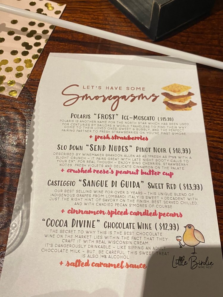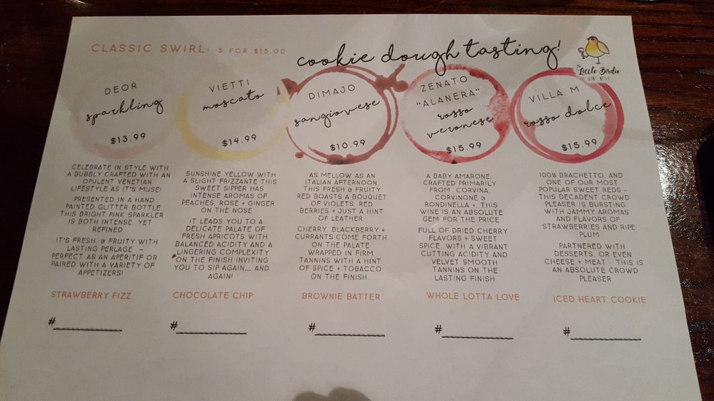 The Little Birdie Wine Nest, located in Parma, OH, is a classy and cozy spot offering a variety of coffee bar options, including Americano, Caramel Macchiato, and Cold Brew Ice Cream Float. Their menu also features delicious treats like Honey Lavender & Cream and Peste Caprese. With offerings such as outdoor seating, free Wi-Fi, and happy hour specials, this charming venue is perfect for groups looking to unwind with beer and wine. The Little Birdie Wine Nest also caters to coffee lovers with options like Mocha and Organic Hot Tea. Whether you're looking to relax with a hot cocoa or enjoy a unique cocktail like the Fancy Pepperoni, this establishment has something for everyone. The friendly staff, unique ambiance, and convenient amenities make The Little Birdie Wine Nest a must-visit destination.